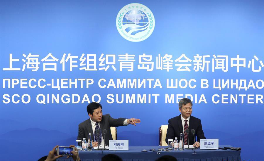 Liao Jinrong (R), head of the international cooperation department with the Ministry of Public Security, attends a press conference on security cooperations among member states of the Shanghai Cooperation Organization (SCO) ahead of the 18th SCO summit in Qingdao, east China's Shandong Province, June 8, 2018.(Xinhua/Yin Gang) The Shanghai Cooperation Organization (SCO) member states will enhance cooperation in face of the challenges of terrorism, drugs, organized cross-border crimes and information security threats, a Chinese official said Friday. The organization is drawing up measures to tackle those challenges, said Liao Jinrong, head of the international cooperation department with the Ministry of Public Security, at a press conference ahead of the 18th SCO summit to be held in Qingdao on Saturday and Sunday.
